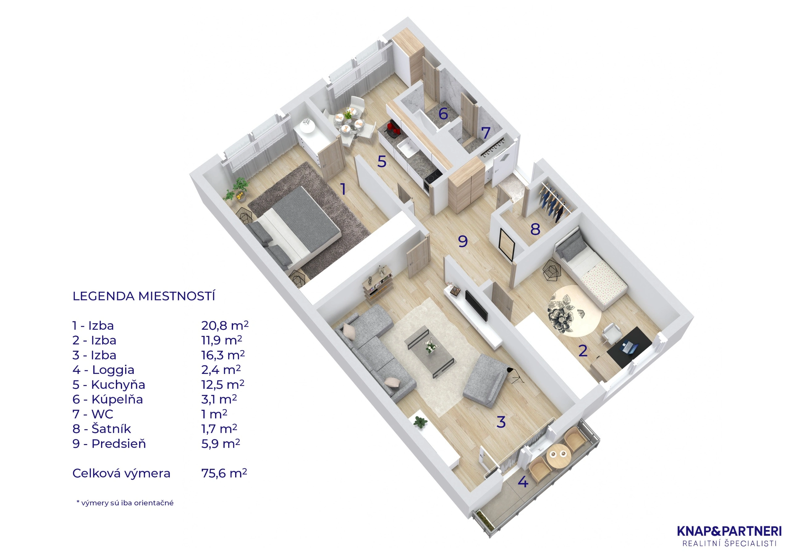 Celková výmera bytu je 75,6 m2 vrátane loggie o výmere 2,4 m2.